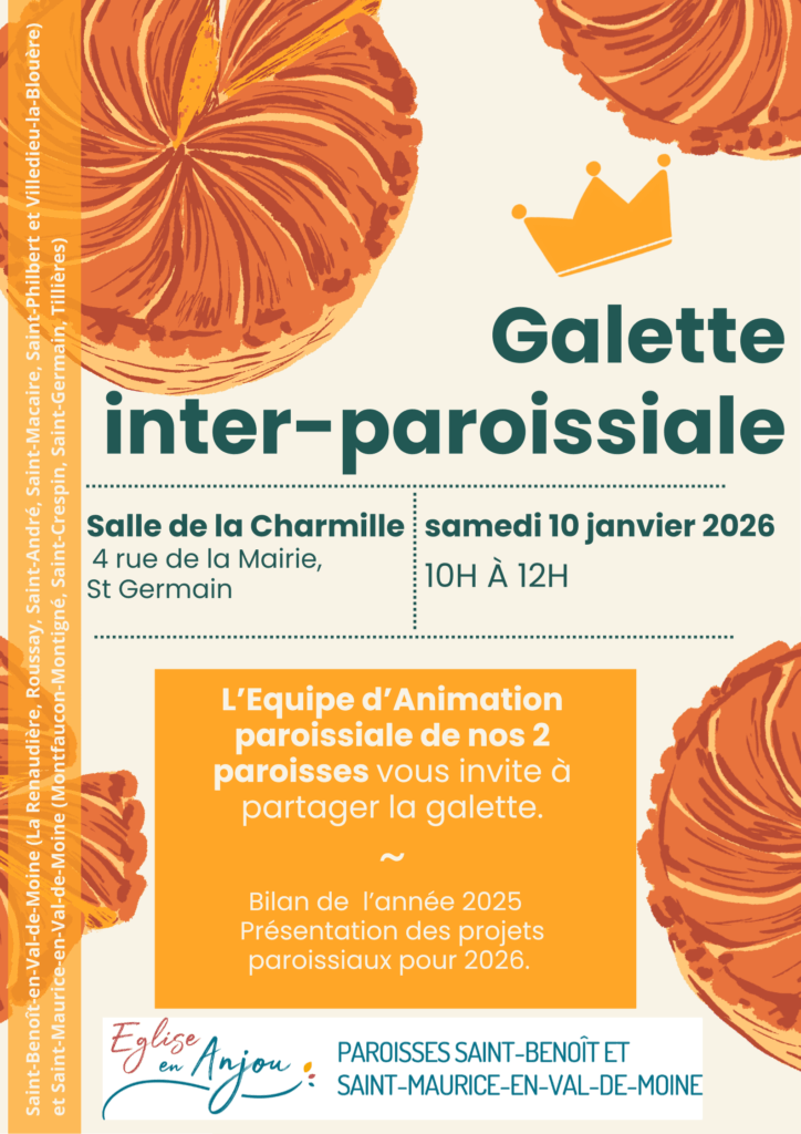 L’EAP (Équipe d’Animation paroissiale) des paroisses de St Benoit et St Maurice en Val de Moine vous invite à partager la galette le samedi 10 janvier 2026.