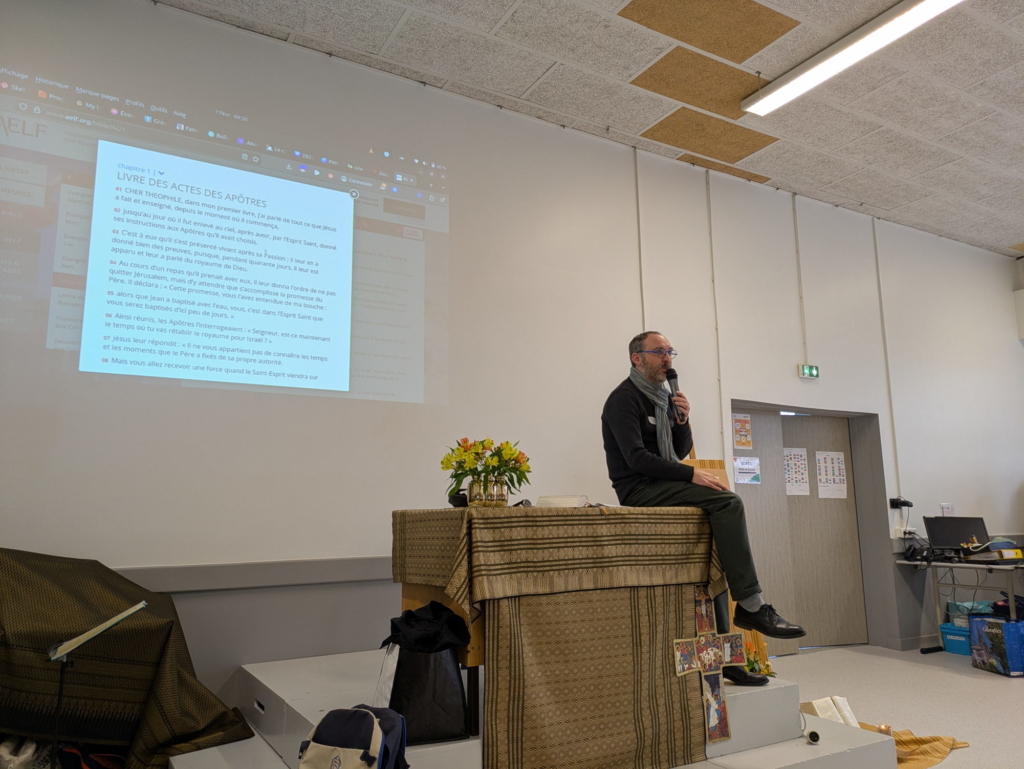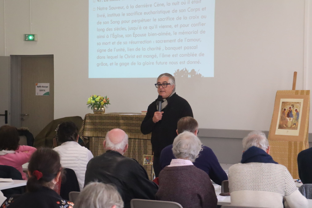 le matin, le père Régis Bompérin a donné un enseignement, en partant du livre des Actes des Apôtres et d’un texte du Pape François sur la liturgie. Il nous a dit comment, dès les premiers temps de l’Église, les chrétiens ont vécu en se souvenant des gestes et des paroles de Jésus, tout en étant tournés vers l’avenir avec la promesse faite par Jésus de son retour. Aujourd’hui encore, nous sommes dans cette « tension », cet équilibre, à vivre avec l’Esprit Saint. C’est ce que nous vivons lors à la messe. Nous ne sommes pas là pour rappeler le dernier repas de Jésus, mais pour le vivre. Maintenant que Jésus « n’est plus là », comment on fait ? Quand on se rassemble avec l’Esprit, Jésus est là. La messe est une rencontre avec Jésus