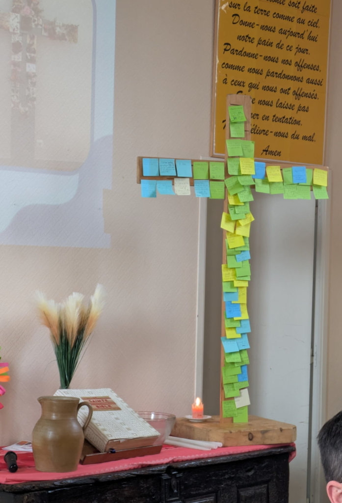 En tablées par service paroissial, les acteurs bénévoles participants ont pu échanger sur ce qu’ils vivent de beau dans leur mission et la joie qu’ils y trouvent. Ils ont aussi déposé les défis et les difficultés qu’ils vivent sur la croix du Christ, qui porte nos soucis. Et ils se sont rendu compte que « c’est pareil chez les autres ».